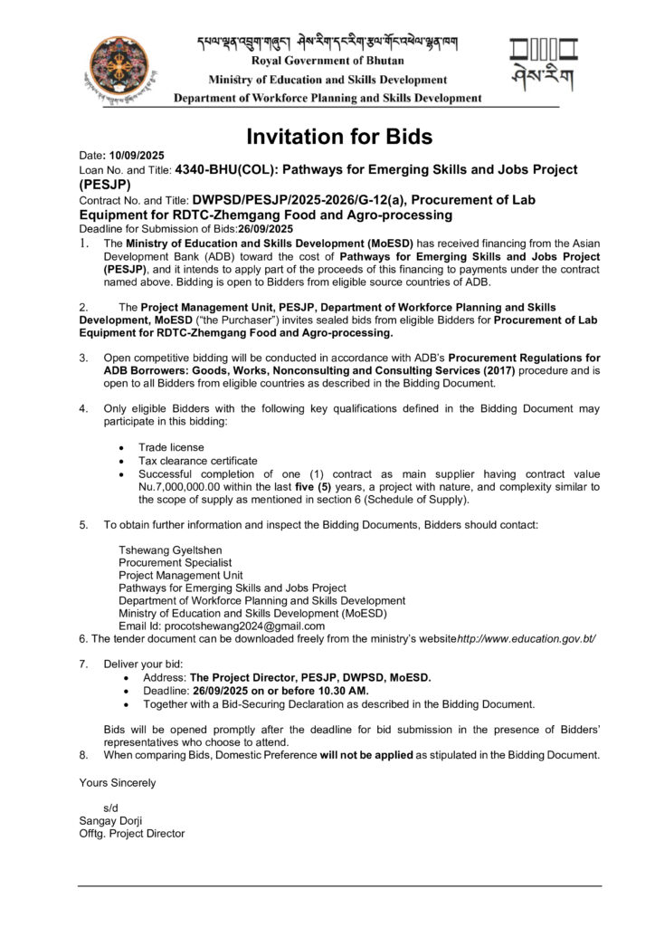 Contract No. and Title: DWPSD/PESJP/2025-2026/G-12(a), Procurement of Lab Equipment for RDTC-Zhemgang Food and Agro-processing