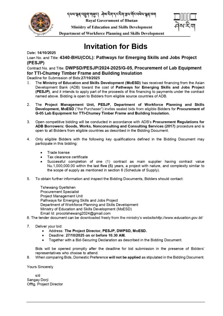 The Project Management Unit, Pathways for Emerging Skills and Jobs Project, Department of Workforce Planning and Skills Development, Ministry of Education and Skills Development (MoESD) invites the qualified bidders to submit Request for Quotations for the following packages.