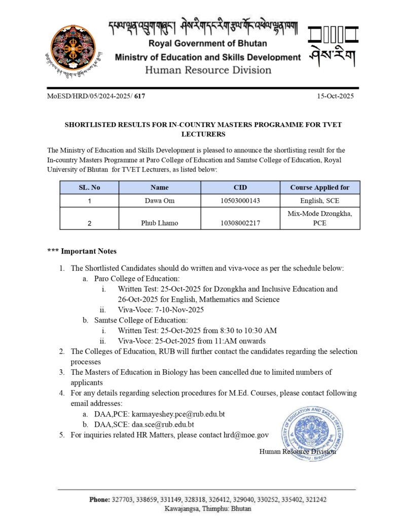 University of Bhutan for TVET Lecturers, as listed below: