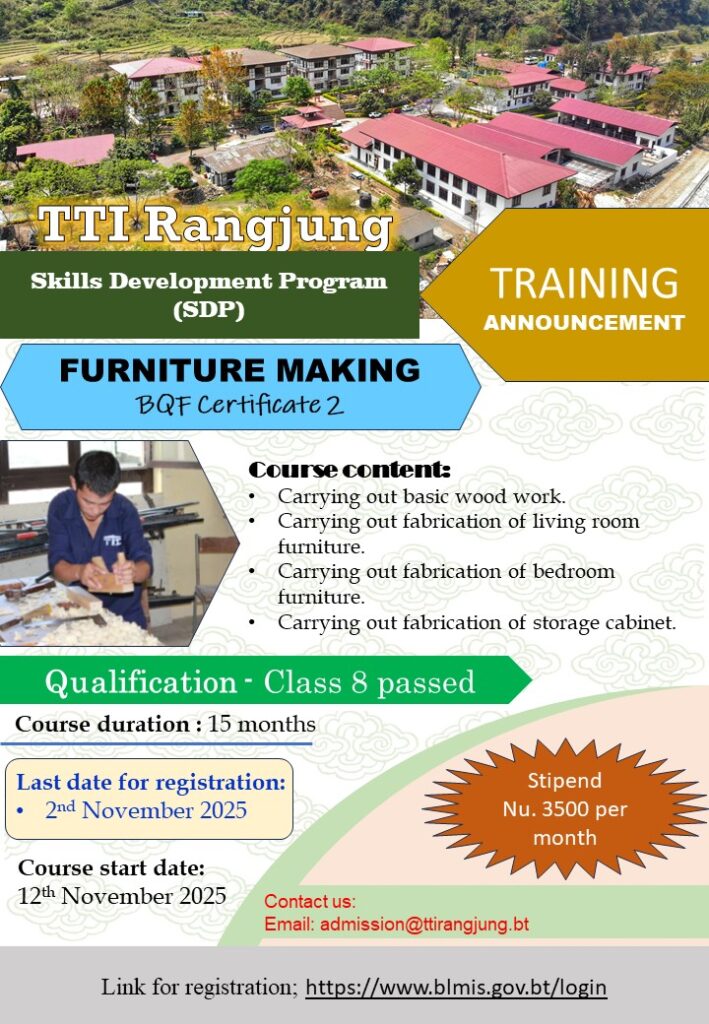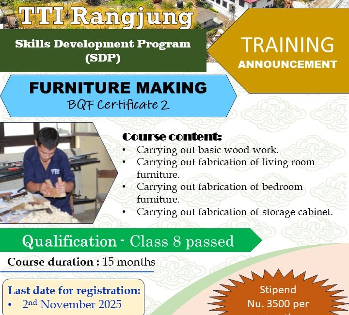 As a part of the Skills Development Program (SDP), Ministry of Education and Skills Development is pleased to announce the availability of following training program at the Technical Training Institute – Rangjung, Trashigang … read more …