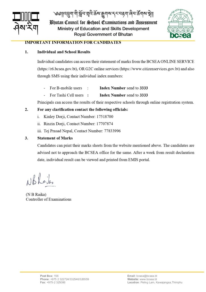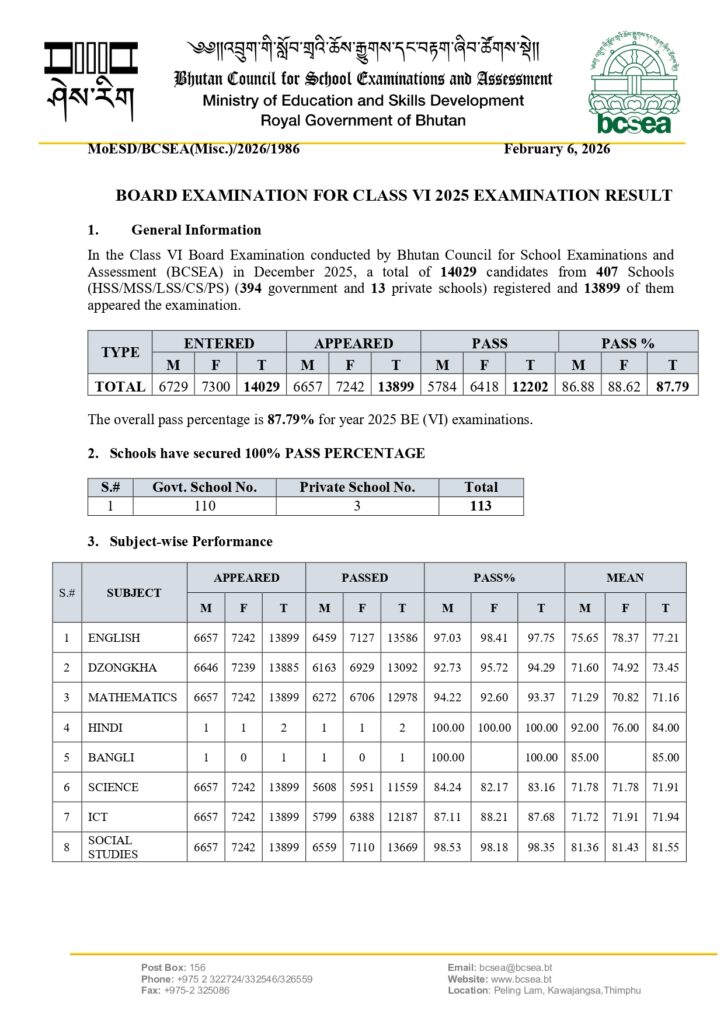 In the Class VI Board Examination conducted by Bhutan Council for School Examinations and Assessment (BCSEA) in December 2025, a total of 14029 candidates from 407 Schools (HSS/MSS/LSS/CS/PS) (394 government and 13 private schools) registered and 13899 of them appeared the examination.