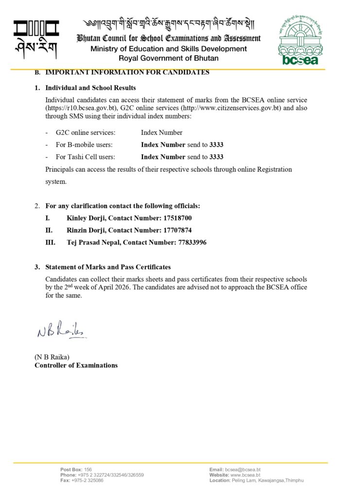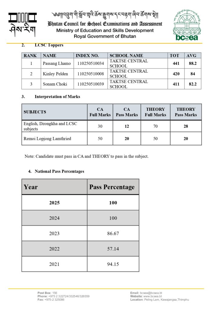 In the Language and Culture Studies Certificate (LCSC) Class X Examination conducted by Bhutan Council for School Examinations and Assessment (BCSEA) in December 2025, a total of 46 candidates from 1 government school registered and 46 appeared the examination.