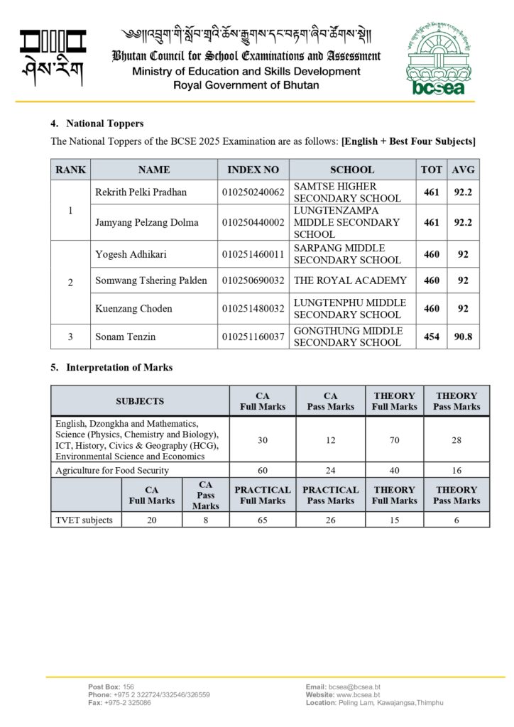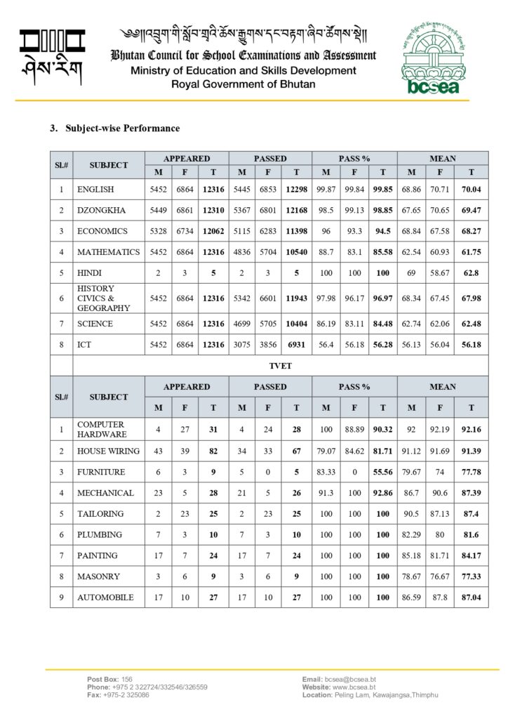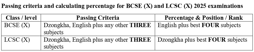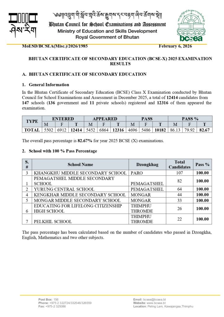 In the Bhutan Certificate of Secondary Education (BCSE) Class X Examination conducted by Bhutan Council for School Examinations and Assessment in December 2025, a total of 12414 candidates from 147 schools (136 government and 11 private schools) registered and 12316 of them appeared the examination.