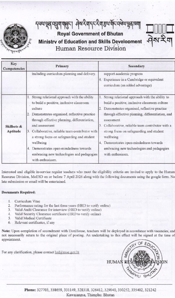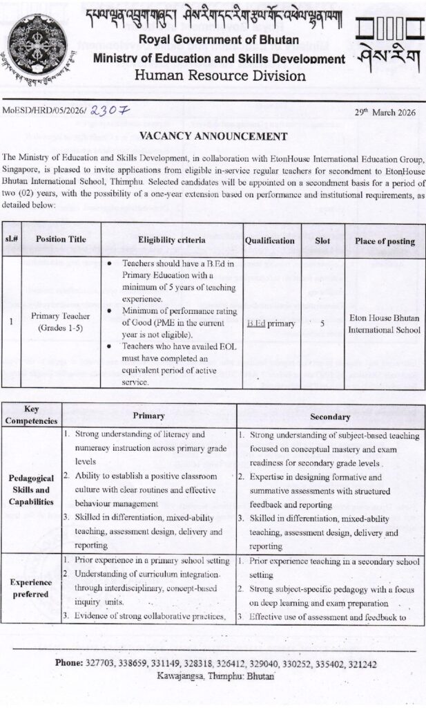 The Ministry of Education and Skills Development, in collaboration with EtonHouse International Education Group, Singapore, is pleased to invite applications from eligible in-service regular teachers for secondment to EtonHouse Bhutan International School, Thimphu. Selected candidates will be appointed on a secondment basus for a period of two years, with the possibility of a one-year extension based on performance and institutional requirements, as detailed below.