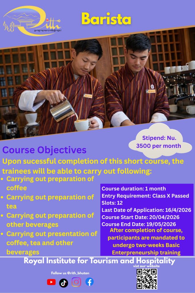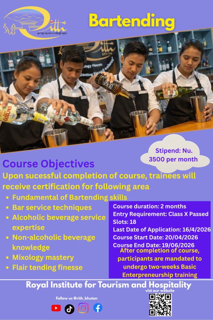 As part of the Skills Development Program, the Royal Institute for Tourism and Hospitality (RITH) announces the availability of Bartending and Barista training funded by the Ministry of Education and Skill Development.